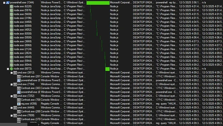 ├── reg.exe (7432) → reg query “HKLM\SOFTWARE\Microsoft\Cryptography” /v MachineGuid
