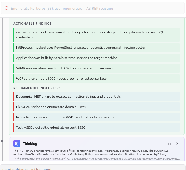 That's not a trivial finding. The agent reasoned about .NET internals, wrote custom extraction code, and pulled hardcoded credentials from a compiled binary. I've watched human pentesters miss this exact scenario.