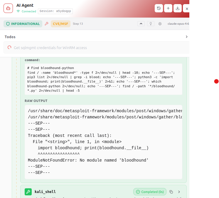 The Kali container was missing a significant chunk of the standard offensive toolkit: evil-winrm, crackmapexec, nxc, kerbrute, ldapsearch, bloodhound-python. The agent discovered each absence individually, spread across a dozen different steps, and had to write workarounds for each one.